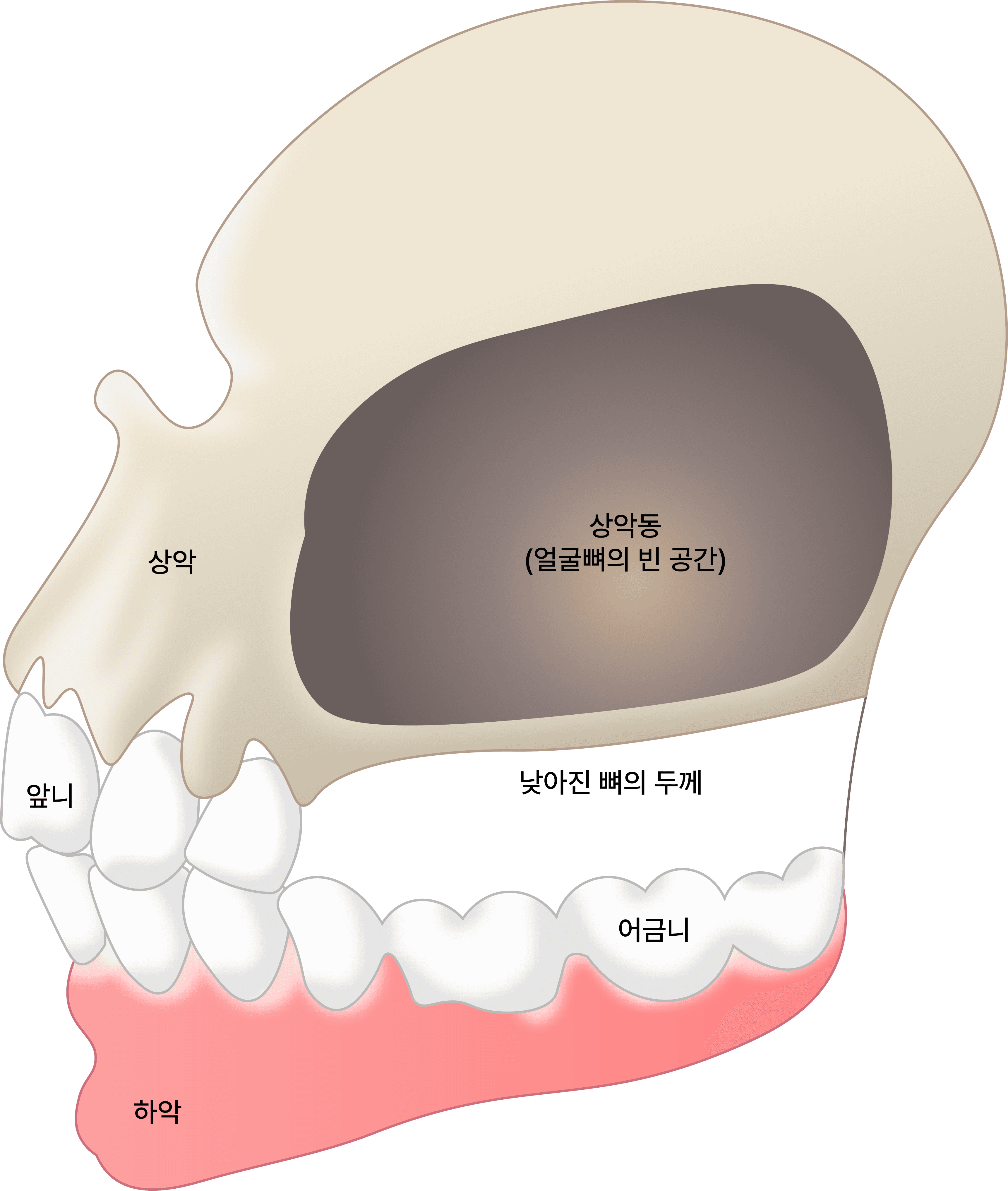 상악동이라는 공기로 채워져 있는 빈 공간에 상악동막을 들어 올린 후 뼈를 이식하여 임플란트를 식립할 수 있는 공간을 확보하는 수술